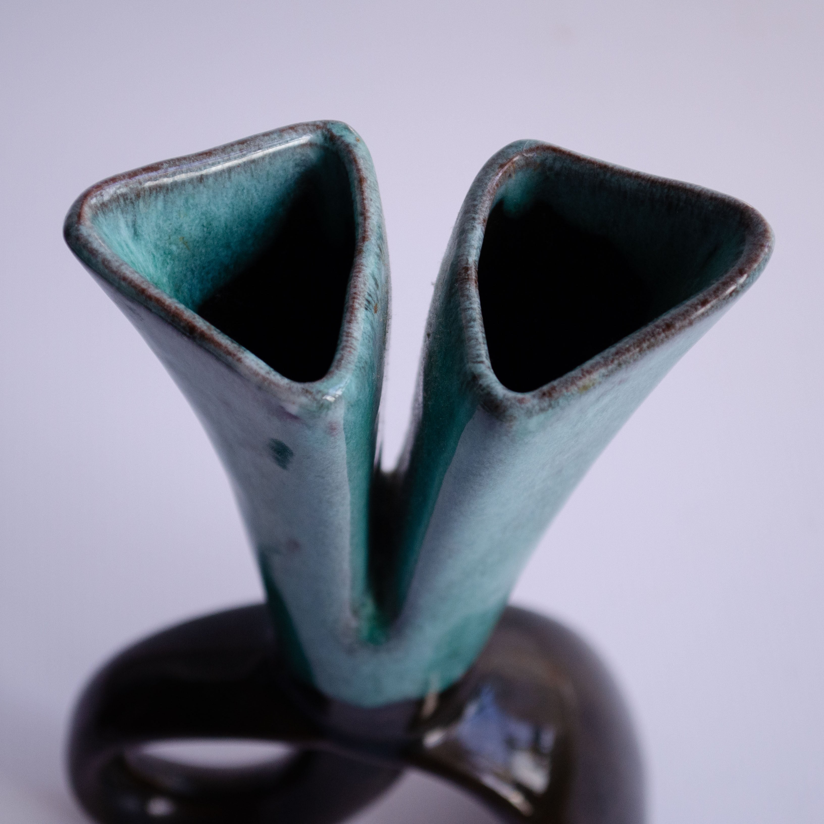 ユニークなフォルムとバイカラーのカラーが目を惹く花器です。
